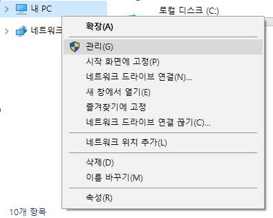 ② 파일탐색기에서 내 PC 우클릭 > 관리(G) > 장치관리자
